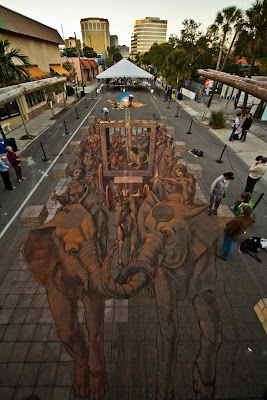 At this year's annual Sarasota Chalk Festival in Florida, renowned inventor of 3D chalk art Kurt Wenner is working on a massive street piece with his team. This year's theme for the festival commemorates the city's historical founding point of the Ringling Bros. Circus. Following the festival's "Circus City, USA" theme, Wenner's large-scale chalk installation features a three-dimensional depiction of classically adorned circus performers marching down the pavement, as if it were their very own parade.