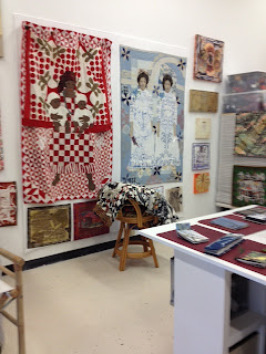 It turned out that just about every quilt I had pinned up was made with vintage fabrics, something I noticed at the last minute so made a theme out of it for my talk. I also covered how certain fortuitous events came together to give me access to people who gave me the boost when I needed it. Then I talked about some of the older work with a pile of Kaffe Fassett fabrics jammed into a big basket in front of me. The reason for that was that everything I was showing was made with either the stripes or the shot cottons. I talked about how I showed a simple piece to Liza that I had made years ago and the next thing I knew I had a huge box of the incredible shot cotton fabrics from Westminister and an offer to design a piece for their book. Which led to being in three books WITH my name included on the cover, something I had never seen done before. I credited this with a lot of teaching offers and a bit more recognition back then. And of course I hd the books in front of me too.